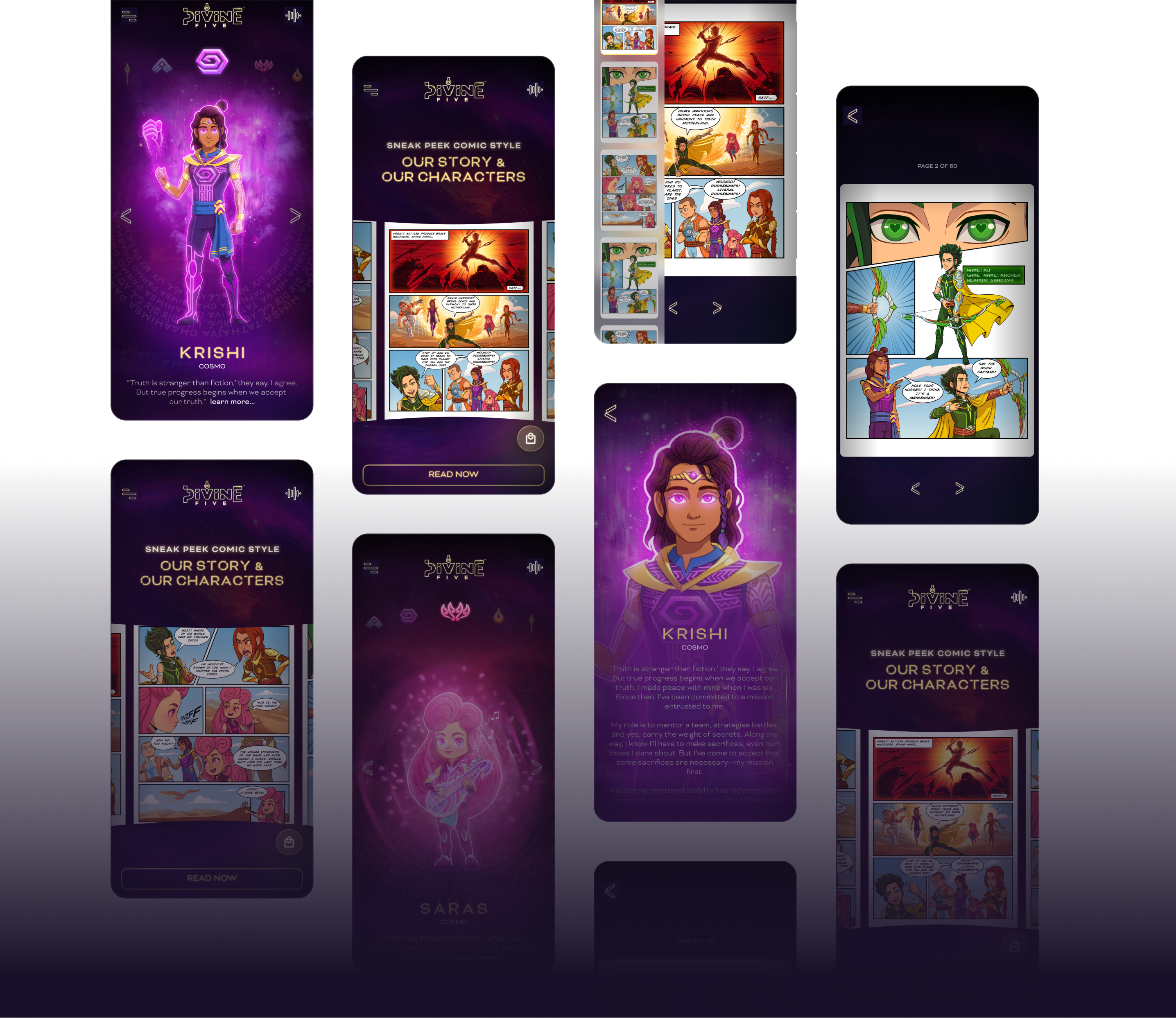 Every scroll is a reveal. We used scroll-triggered animations and atmospheric transitions to mirror the pacing of an unfolding narrative — drawing users deeper into the Divine Five universe with each movement, creating a portal that brings the Divine Five universe to life on both mobile and desktop.